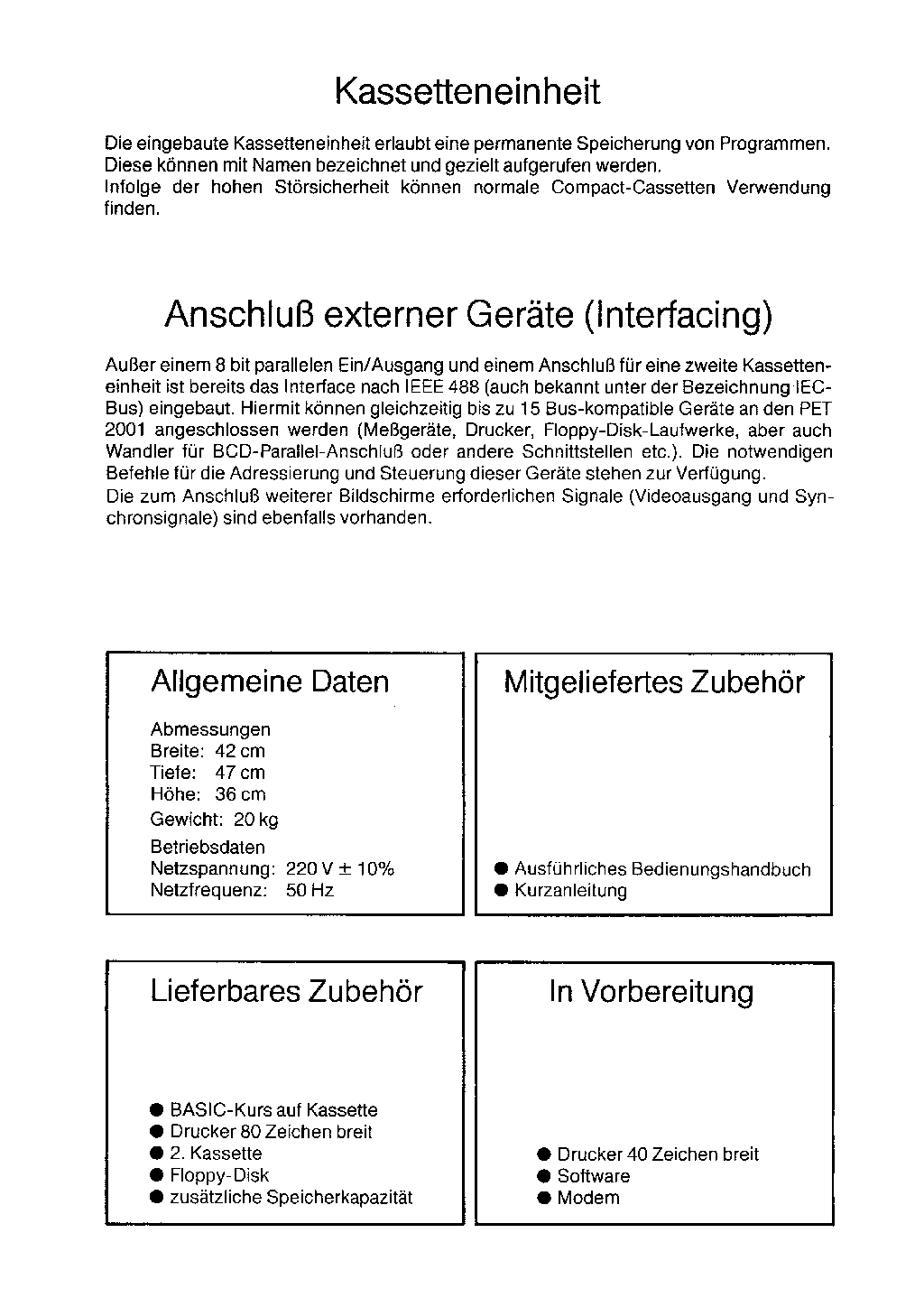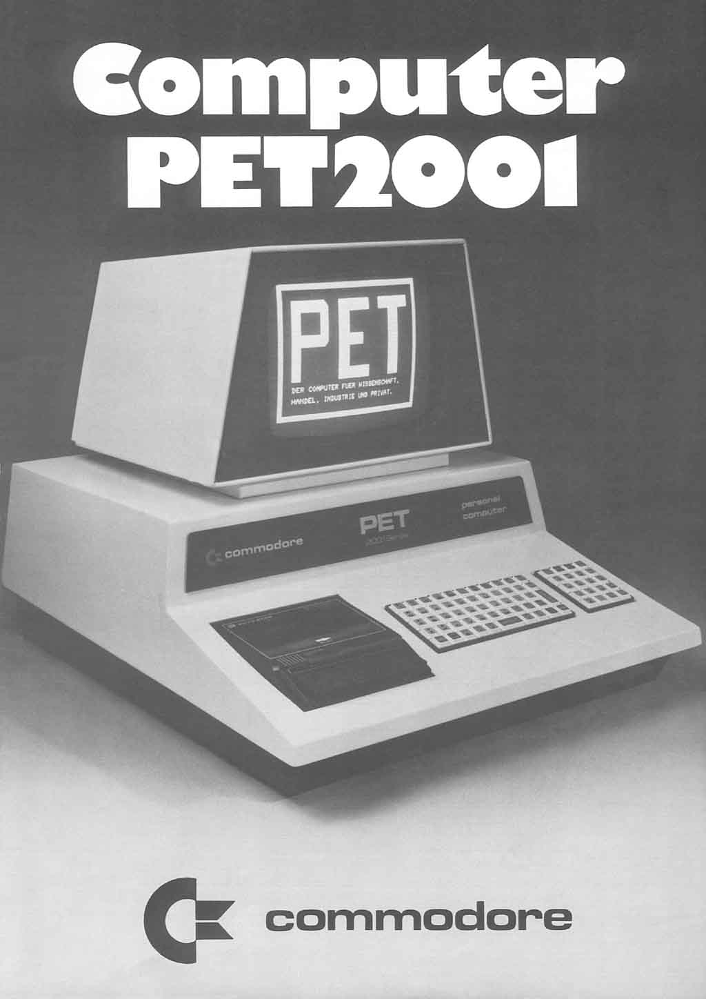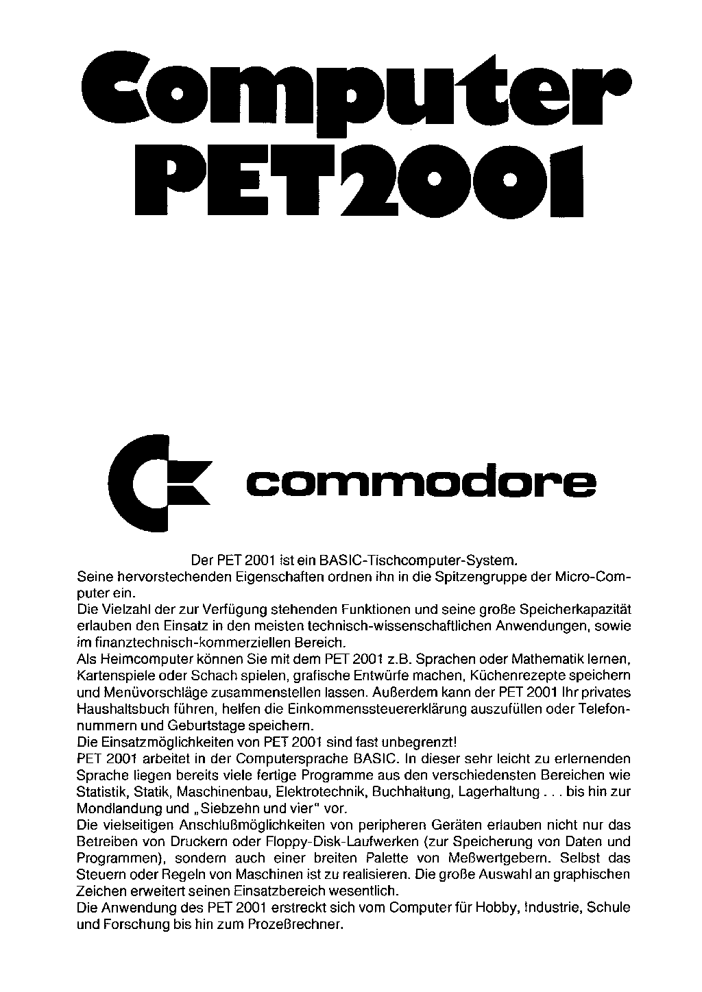 Ein Prospekt aus dem Jahre 1977, der die verschiedenen Einsatzmöglichkeiten und die Leistungsfähigkeit des PET2001 anpreist. Da der Name "PET" lizenzrechtlich für die Firma Philips geschützt ist, war diese Maschine, im Gegensatz zum internationalen Markt, in Deutschland das einzige Modell mit diesem Namen.
