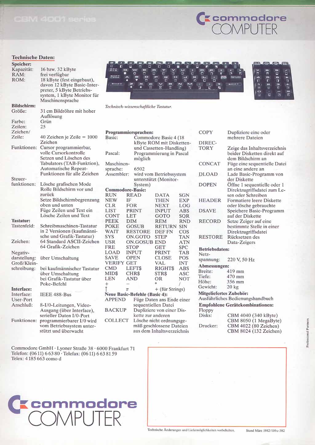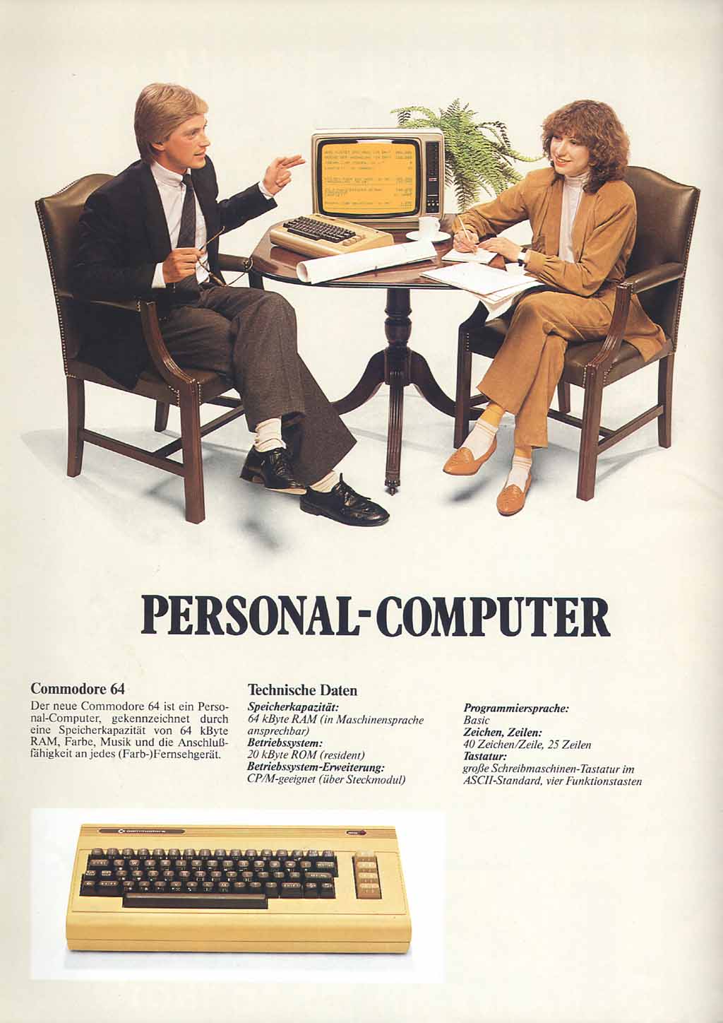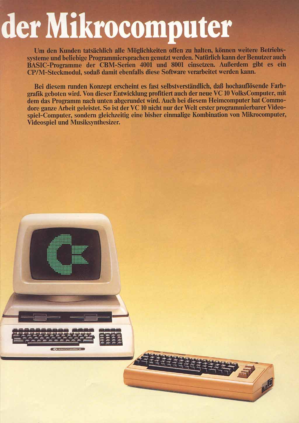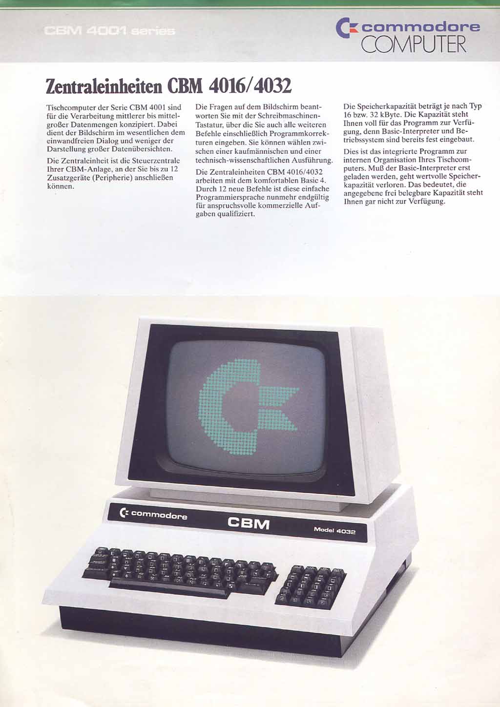Ein Prospekt aus dem Jahre 1977, der die verschiedenen Einsatzmöglichkeiten und die Leistungsfähigkeit des PET2001 anpreist. Da der Name "PET" lizenzrechtlich für die Firma Philips geschützt ist, war diese Maschine, im Gegensatz zum internationalen Markt, in Deutschland das einzige Modell mit diesem Namen.