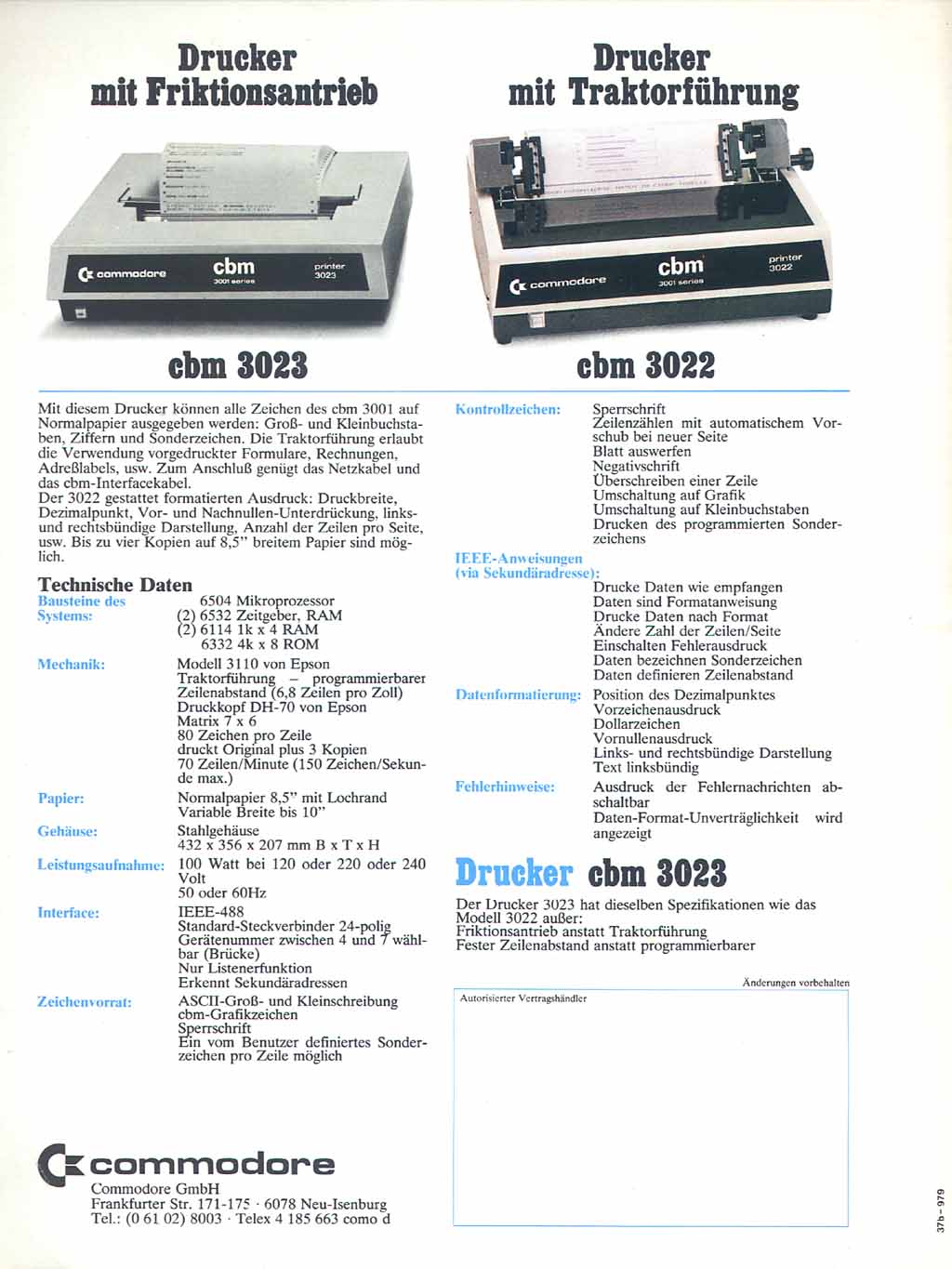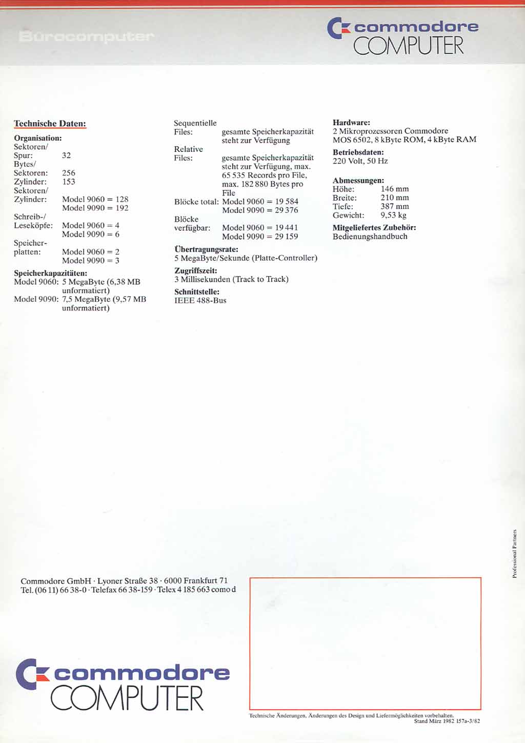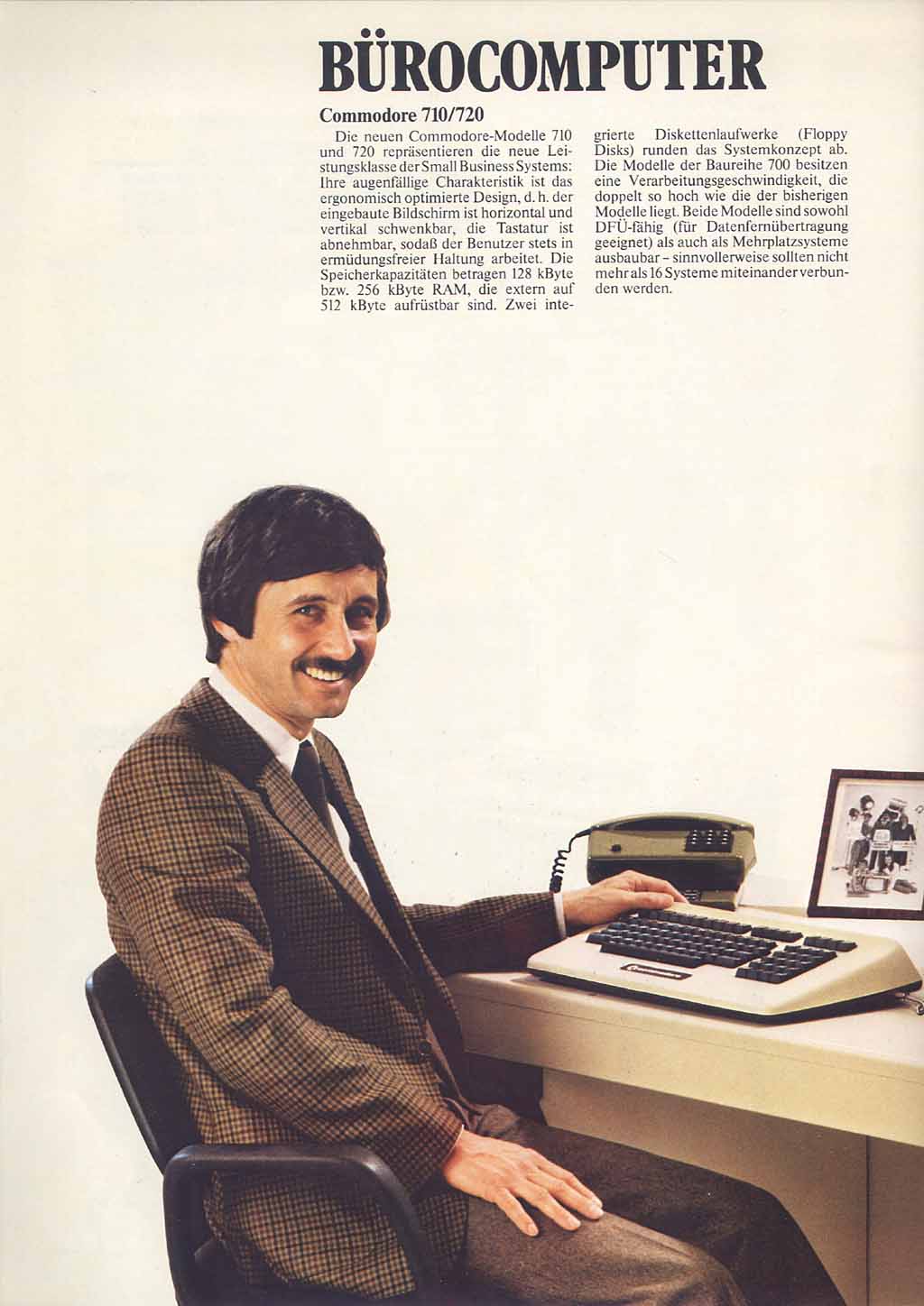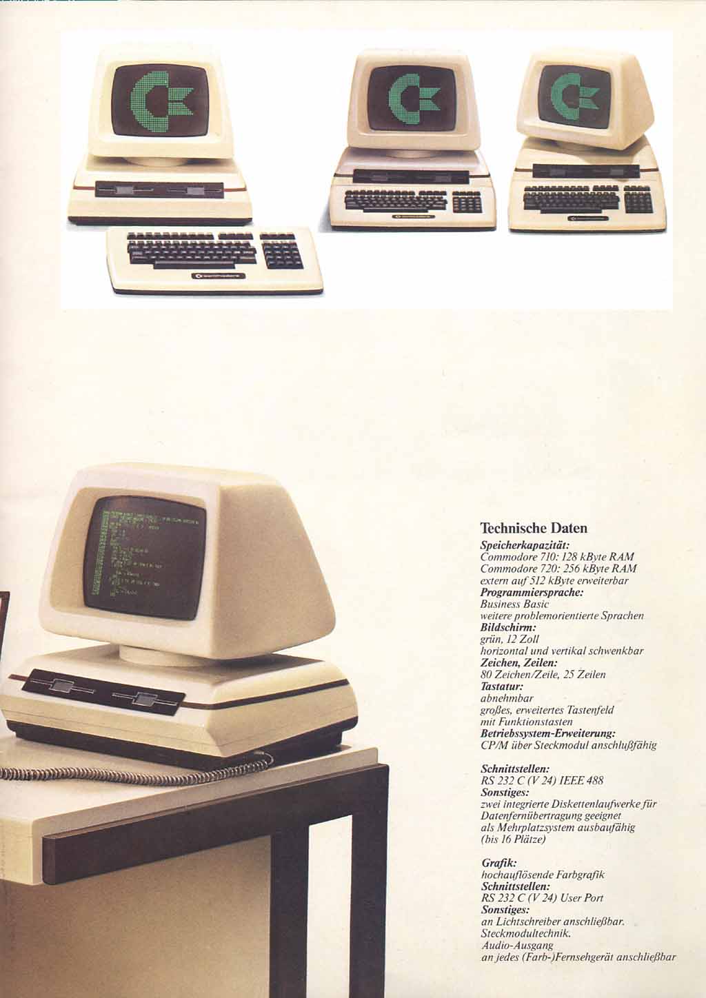 Auch die abgebildeten CBM7xx-Rechner sind Muster ohne Wert! Abgesehen davon, daß die später tatsächlich erschienenen Geräte eine etwas andere Form besaßen, erkennt man bei genauerem Hinsehen, daß die eingebauten Doppellaufwerke nur aufgesetzte Blenden sind. Merkwürdigerweise zeigen die Abbildungen den bekannten Monochrom-Bildschirm, im Werbetext wird aber mehrfach auf "hochauflösende" Farbgrafik hingewiesen. Das im Text angesprochene CP/M-Modul bestand später aus einer Tochterplatine mit 8088-Prozessor, die dann (warum wohl?) als "MS-DOS"-fähig angepriesen wurde. Diese Platine war scheinbar zwar erhältlich, fiel aber dann, ebenso wie die Doppellaufwerke, einer "low cost"-Variante dieses Rechnertyps zum Opfer.