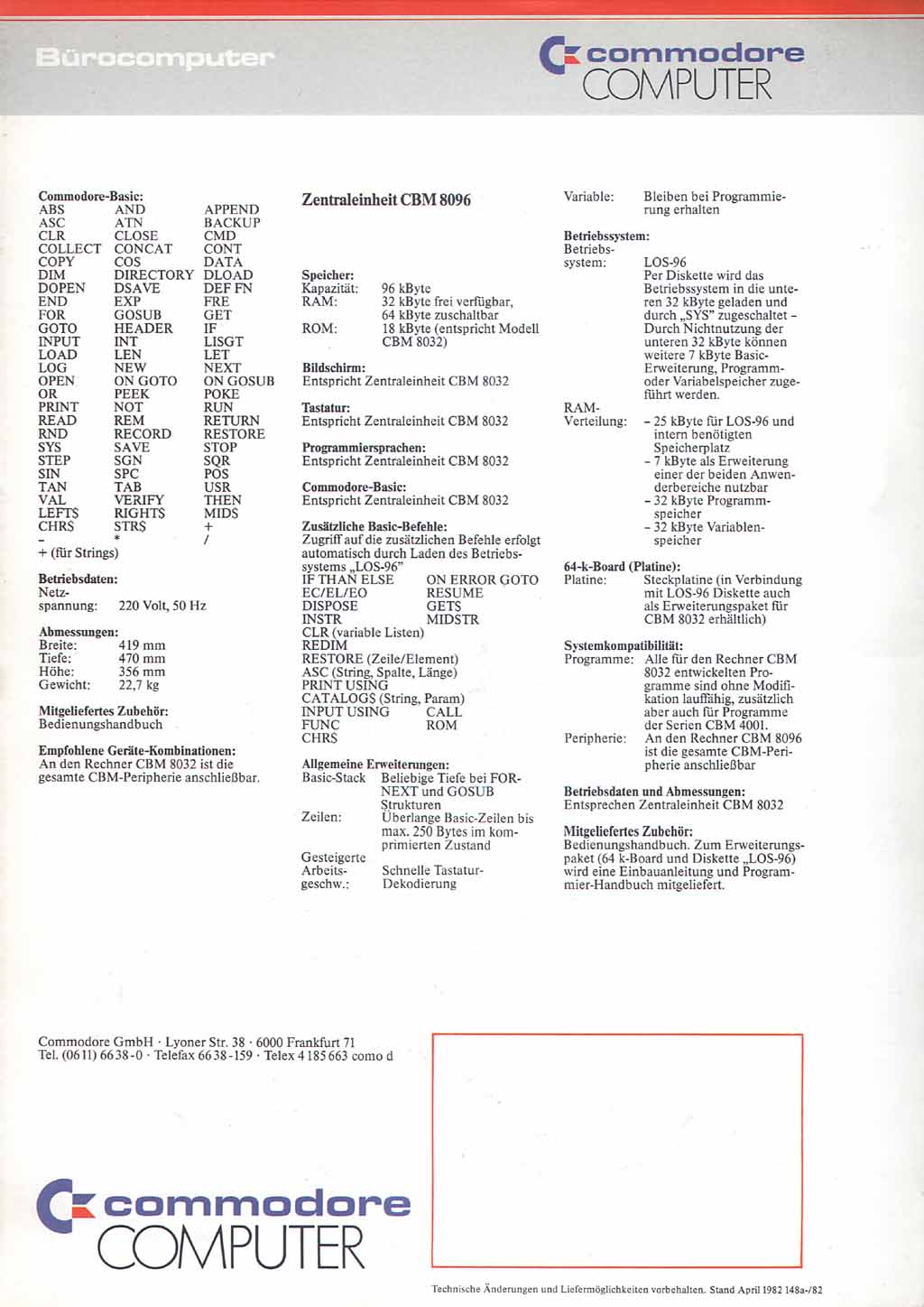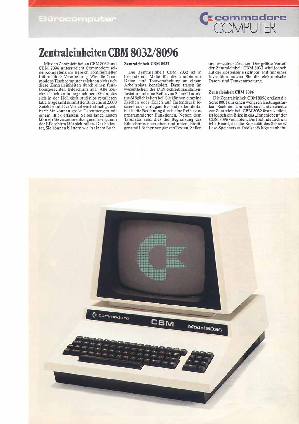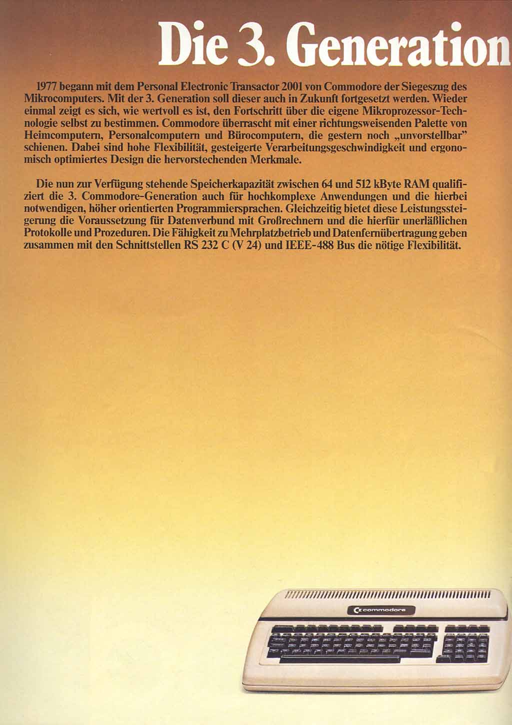 Im selben Jahr kommt der 8000er auf den Markt, der jetzt serienmäßig 80 Zeichen/Zeile anzeigen kann und optional mit deutscher Tastatur bestückt wird. Außerdem gelingt Commodore mit einer Zusatzplatine und einem von Diskette nachladbaren Betriebssystem das Kunststück, die durch die Prozessorarchitektur bedingte magische 64 kB-Grenze zu überwinden. Obwohl die Zusatzplatine 64 kB groß ist, wirkt sich nachteilig aus, daß das Betriebsystem davon gleich 32 kB mit Beschlag belegt und der User statt der bisher üblichen 32 kB doch nur 64 kB zur Verfügung hat!