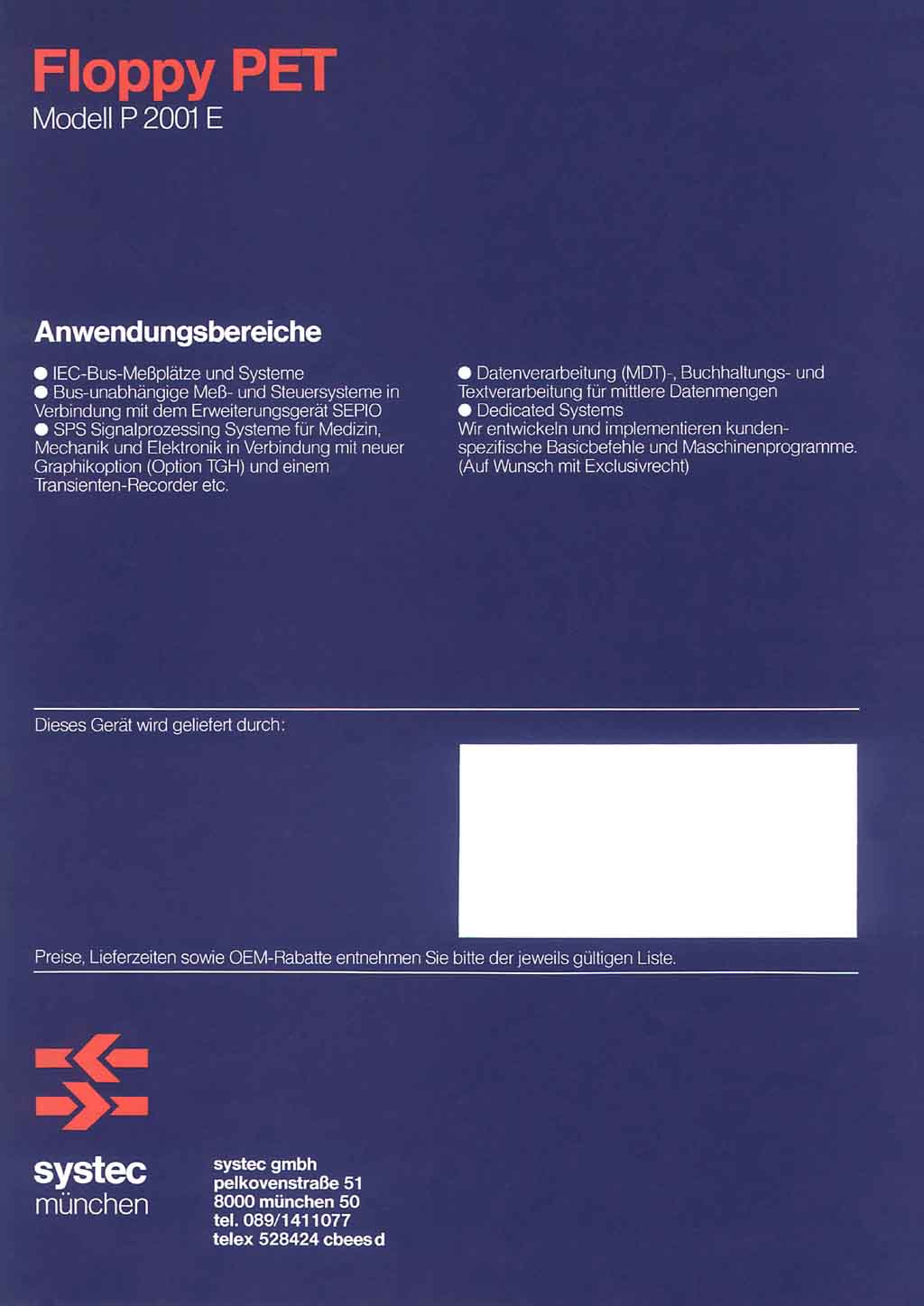 Here you see a PET2001 as a conversion made by "Systec" (Munich) with enlarged keyboard, integrated floppy drive and seperated! cursor-keys. Mark the "gigantic" memory capacity of the disk drive (Page 3)!
