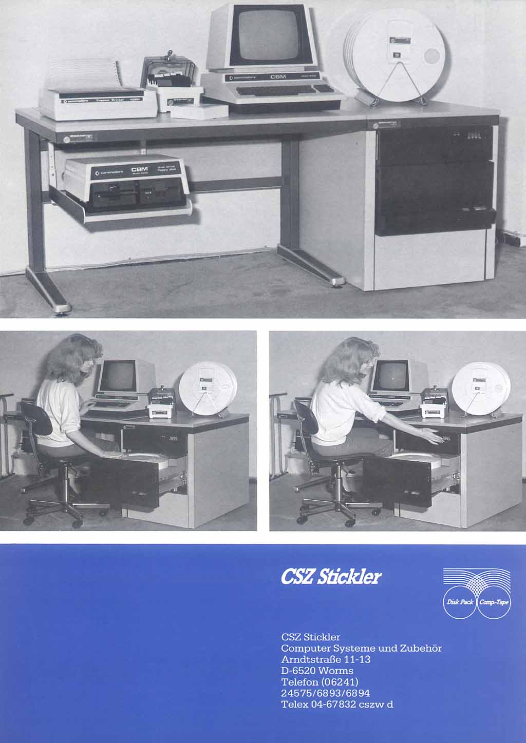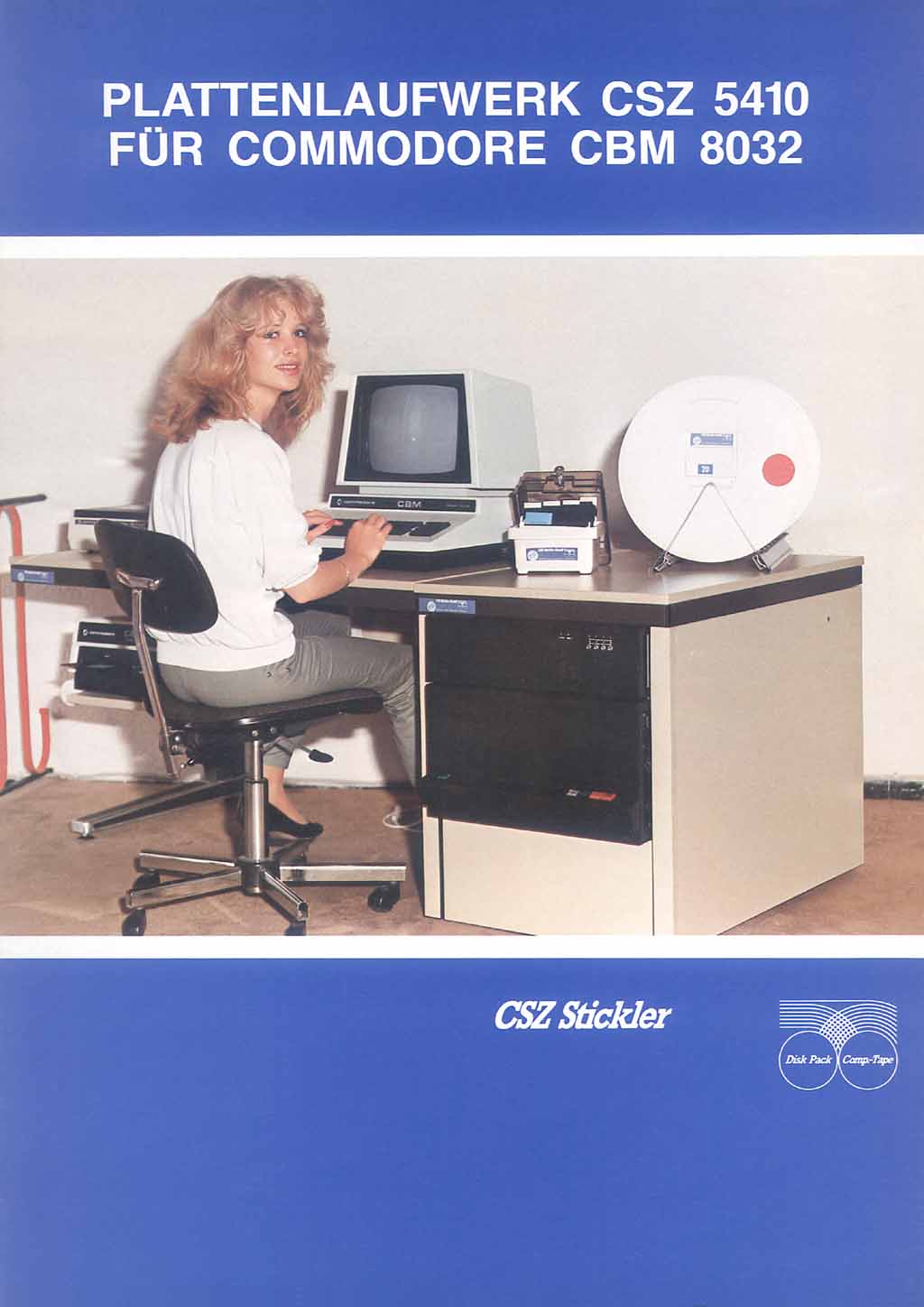 The manufacturer "CSZ Stickler" from Worms/Germany introduces a substitutionable hard-disk-system for the CBM8000-Series. It consists of a firmly installed disk with a size of 5 MB which can be expanded with substitutionable disks of the same capacity. Each of this magnetic disks has a diameter of 14"! At the same time Commodore offers the hard-disk-units CBM D9060/9090. They are installed in the housing of the single-floppy-drive CBM2031 HP and have a capacity up to 7,5 MB!
