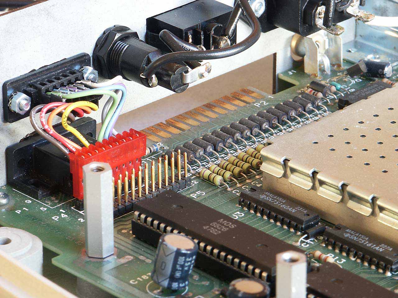 Auf dem nächsten Bild erkennt man die, für einen Homecomputer unverzichtbaren, übereinander angeordneten Joystickports. Die Steckerleiste vor den Joystickports ist der sogenannte "User Port", der bei diesem Rechnertyp allerdings nirgendwo nach aussen geführt ist. Der Sicherungshalter rechts daneben ist im Original nicht vorhanden, die Bohrung dafür ist normalerweise mit einer Kunststoffkappe verschlossen.