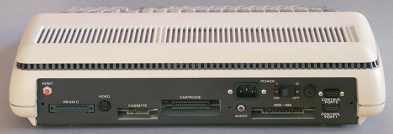 Von Aussen läßt sich der P500 von seinem Zwillingsbruder CBM6X0 nur durch die grüne Leuchtdiode und zwei zusätzliche Joystickports auf der Rückseite unterscheiden. Daß auf dem links gezeigten Bild der Rückseite weder Typenschild noch der Aufkleber mit Angaben zur Stärke der Sicherung und der benötigten Betriebsspannung zu finden sind, ist schnell erklärt: Es handelt sich bei meinem Gerät nicht um eines der sehr seltenen "Originale", sondern um einen aus Originalteilen bestehenden "Eigenbau". Die bereits gefertigten Einzelteile wurden nämlich, als Commodore die Markteinführung des P500 "kippte", an den Elektronikhändler "Völkner" abgegeben, der diese dann billig verkaufte.